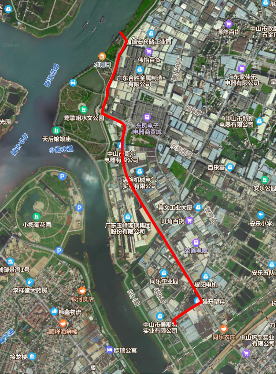 項目建設(shè)地點位于中山市東鳳鎮(zhèn)同樂工業(yè)片區(qū)。項目計劃自東鳳水廠取水泵站沿鶯歌咀路、東鳳玉峰路,新建一條DN1200原水管,與現(xiàn)有提前鋪設(shè)好的第二條DN1200過堤管接駁,管線長度約3 km。項目管材采用鋼管、球墨鑄鐵管,管道建設(shè)采用明裝鋪設(shè)、埋地鋪設(shè)方式。