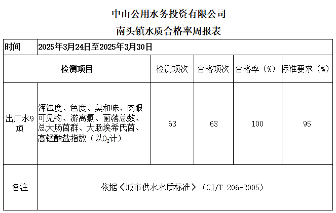 中山南頭鎮(zhèn)水質(zhì)合格率(2025年3月24日至2025年3月30日)