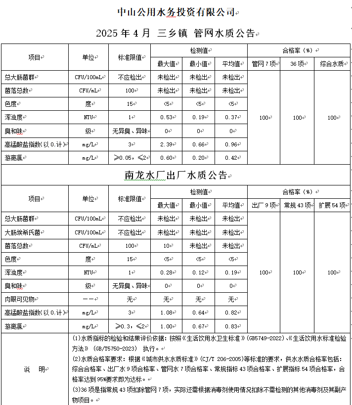 中山市三鄉(xiāng)鎮(zhèn)水質(zhì)公告(2025.04.01-2025.04.30)