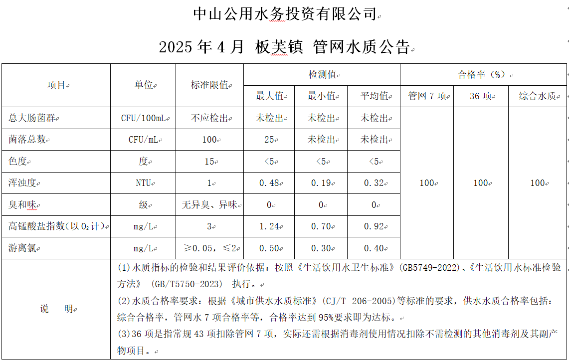 中山市板芙鎮(zhèn)水質(zhì)公告(2025.04.01-2025.04.30)