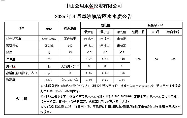 中山市阜沙鎮(zhèn)水質(zhì)公告(2025.04.01-2025.04.30)