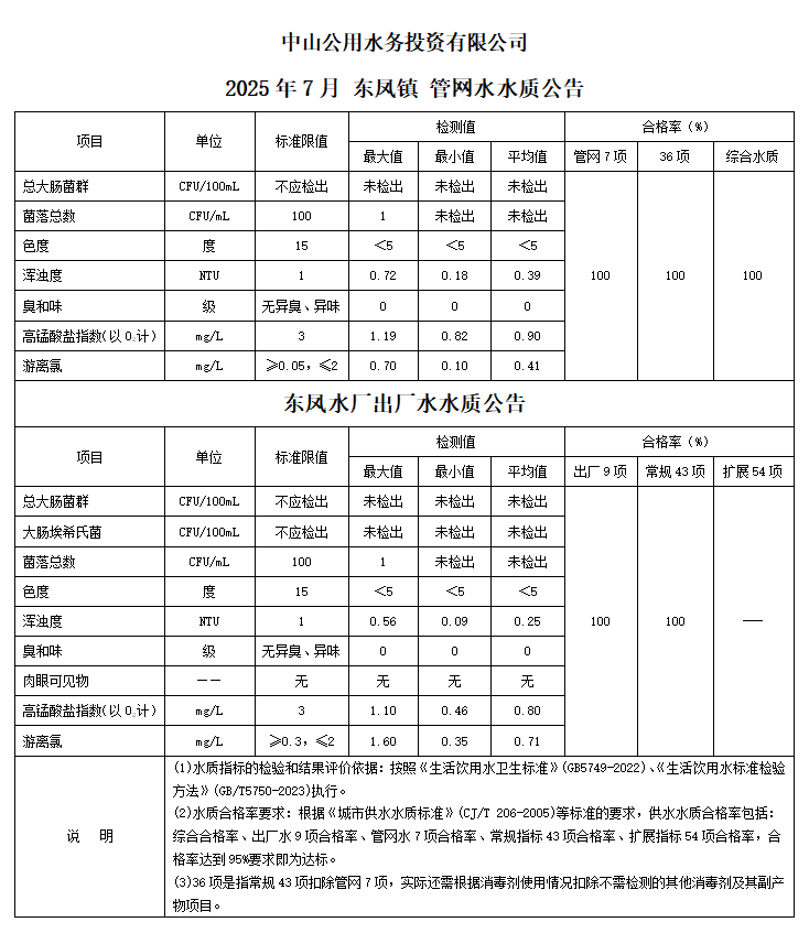 中山市東鳳鎮(zhèn)水質(zhì)公告(2025.07.01-2025.07.31)