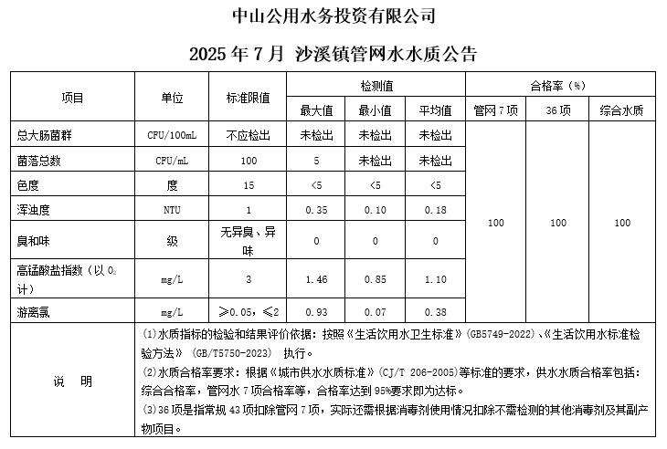 中山市沙溪鎮(zhèn)水質(zhì)公告(2025.7.01-2025.7.31)