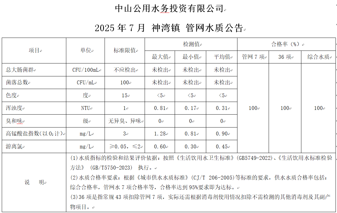 中山市神灣鎮(zhèn)水質(zhì)公告(2025.07.01-2025.07.31)