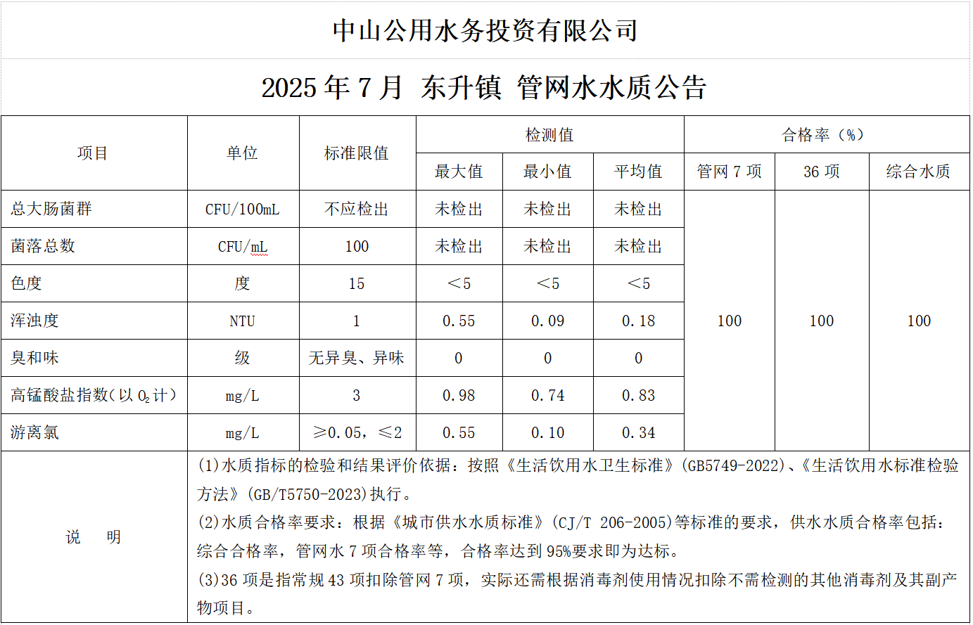 中山市東升鎮(zhèn)水質公告(2025.07.01-2025.07.31)