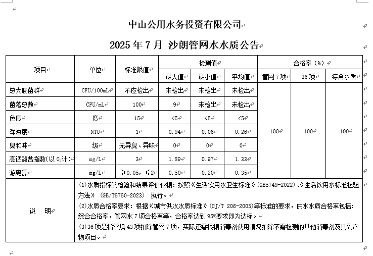 中山市西區(qū)沙朗水質(zhì)公告(2025.07.01-2025.07.31)