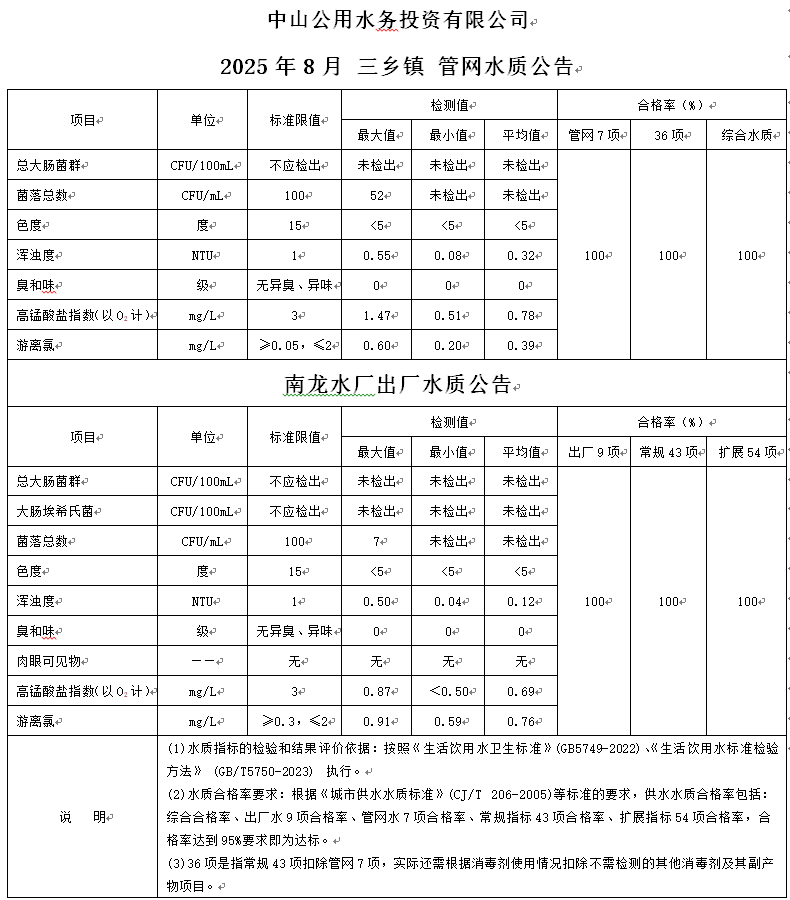 中山市三鄉(xiāng)鎮(zhèn)水質(zhì)公告(2025.08.01-2025.08.31)