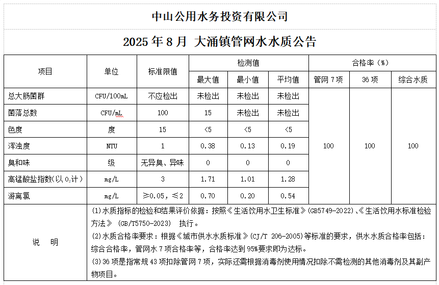 中山市大涌鎮(zhèn)水質(zhì)公告(2025.08.01-2025.08.31)