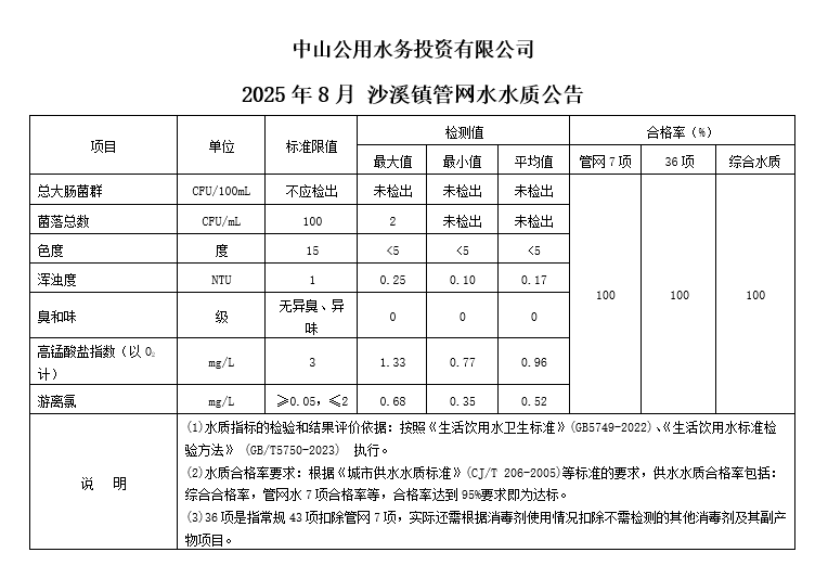 中山市沙溪鎮(zhèn)水質(zhì)公告(2025.08.01-2025.08.31)