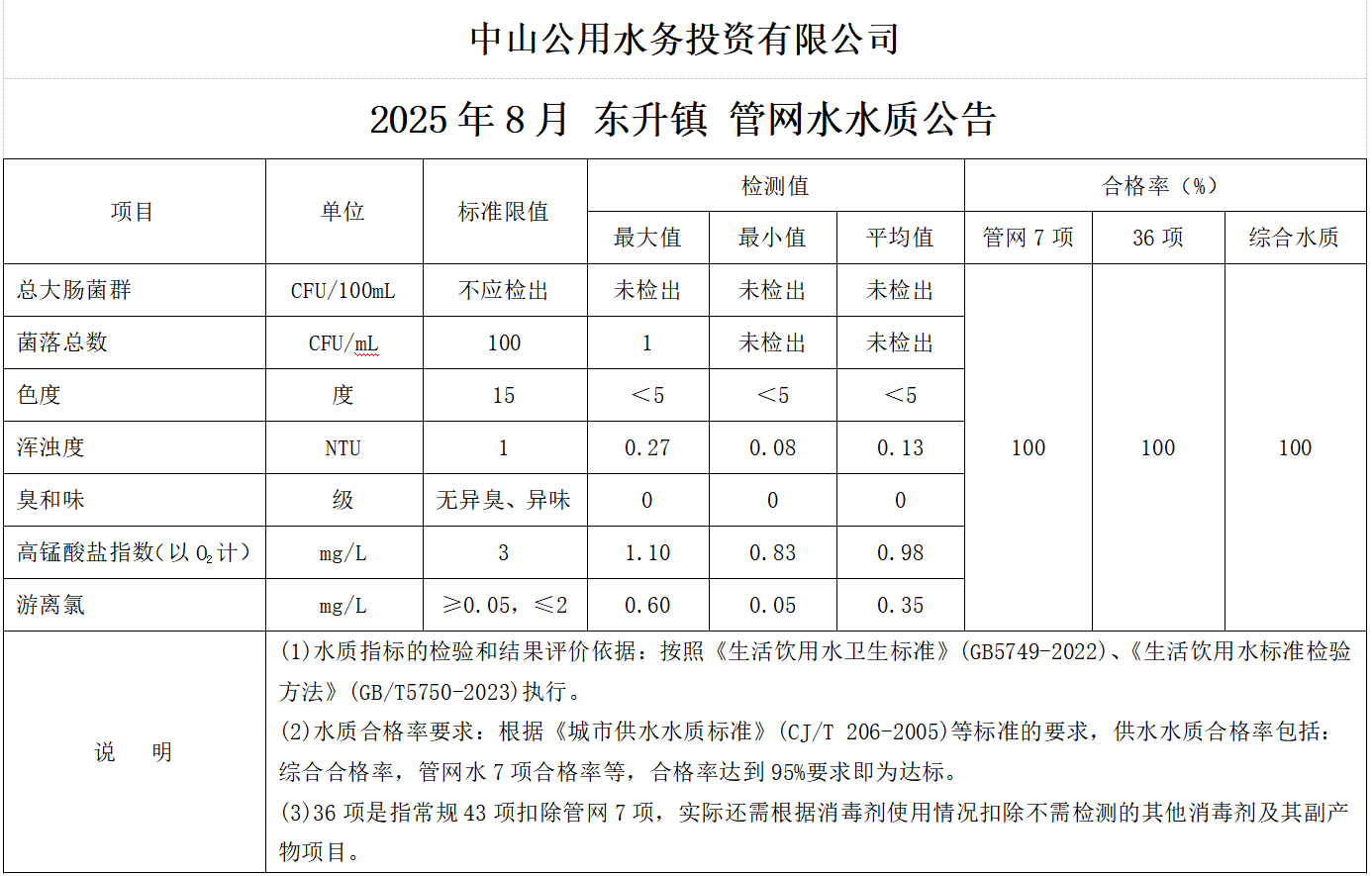 中山市東升鎮(zhèn)水質(zhì)公告(2025.08.01-2025.08.31)