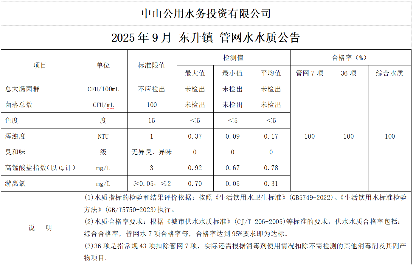 中山市東升鎮(zhèn)水質(zhì)公告(2025.09.01-2025.09.30)