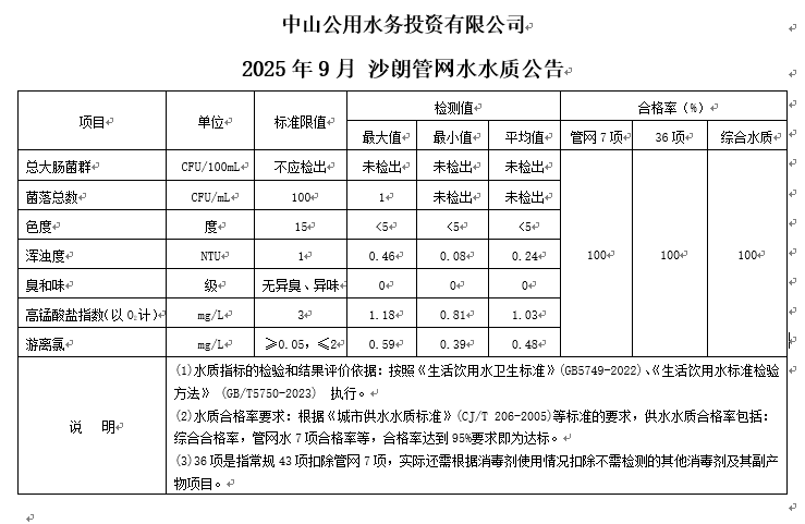 中山市西區(qū)沙朗水質(zhì)公告(2025.09.01-2025.09.30)