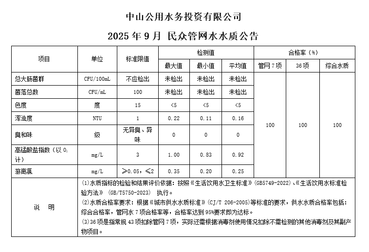 中山市民眾街道水質(zhì)公告(2025.9.1-2025.9.30)