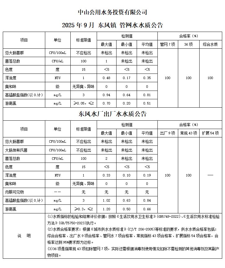 中山市東鳳鎮(zhèn)水質(zhì)公告(2025.09.01-2025.09.30)