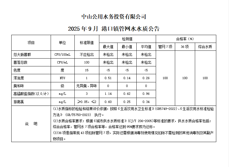 中山市港口鎮(zhèn)水質(zhì)公告(2025.09.01-2025.09.30)