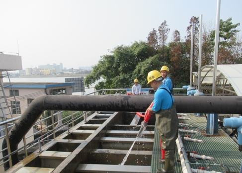 此次清洗工作主要針對反應(yīng)沉淀池中的底泥、斜管、以及池壁表面的附著物進(jìn)行清理,由于池體較小,設(shè)備結(jié)構(gòu)較為復(fù)雜,為此采取人工清洗方式開展清洗工作。清洗過程中,廠區(qū)工作人員不怕苦不怕累,任勞任怨,加班加點(diǎn),互相配合,充分發(fā)揮團(tuán)隊(duì)合作精神,保質(zhì)保量完成了本次清洗維護(hù)任務(wù)。不僅如此,南頭供水對廠區(qū)內(nèi)一級泵房、二級泵房以及一廠儀表間、應(yīng)急室的地面,基座等區(qū)域進(jìn)行“亮化”工程,刷地坪漆,使供水廠面貌煥然一新。